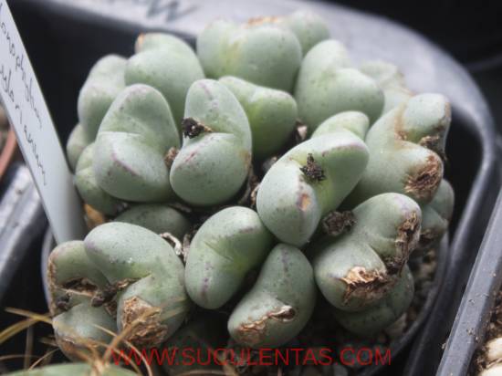 Conophytum taylorianum ((Dinter & Schwantes) N.E.Br. 1926) Plante succulente vivace, aux corps compacts, globuleux ou cylindriques, formés d''une ou deux feuilles fusionnées qui stockent l''eau. Chaque corps présente une fente apicale et pousse en formant des colonies denses. Les fleurs sont solitaires, généralement blanches ou jaunes. Le fruit est une capsule libérant des graines minuscules. Culture facile. Plus d’informations Étymologie : En l'honneur du botaniste Taylor.Provenance: Afrique du Sud, Province du Cap-Nord.